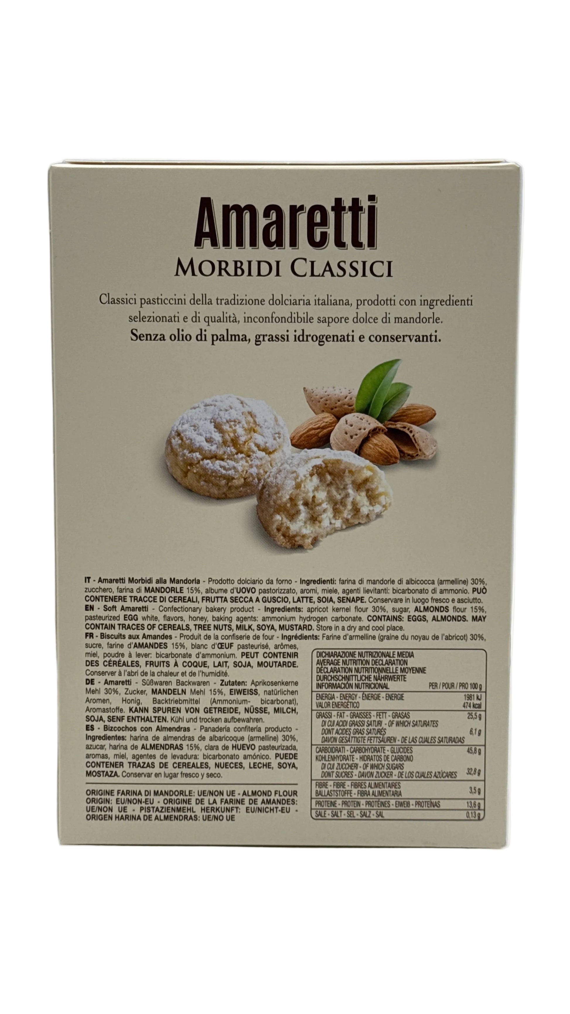 Klassische italienische Amaretti von Falcone – zarte Mandelkekse mit intensivem Aroma und charakteristischer Sprödheit. Hergestellt nach bewährter Tradition mit hochwertigem Mandelmehl und feinen Zutaten. Diese 170g-Packung präsentiert das authentische Geschmackserlebnis der piemontesischen Gebäckkunst. Perfekt als Begleitung zu Espresso oder als elegante Zutat für Desserts und Backkreationen.