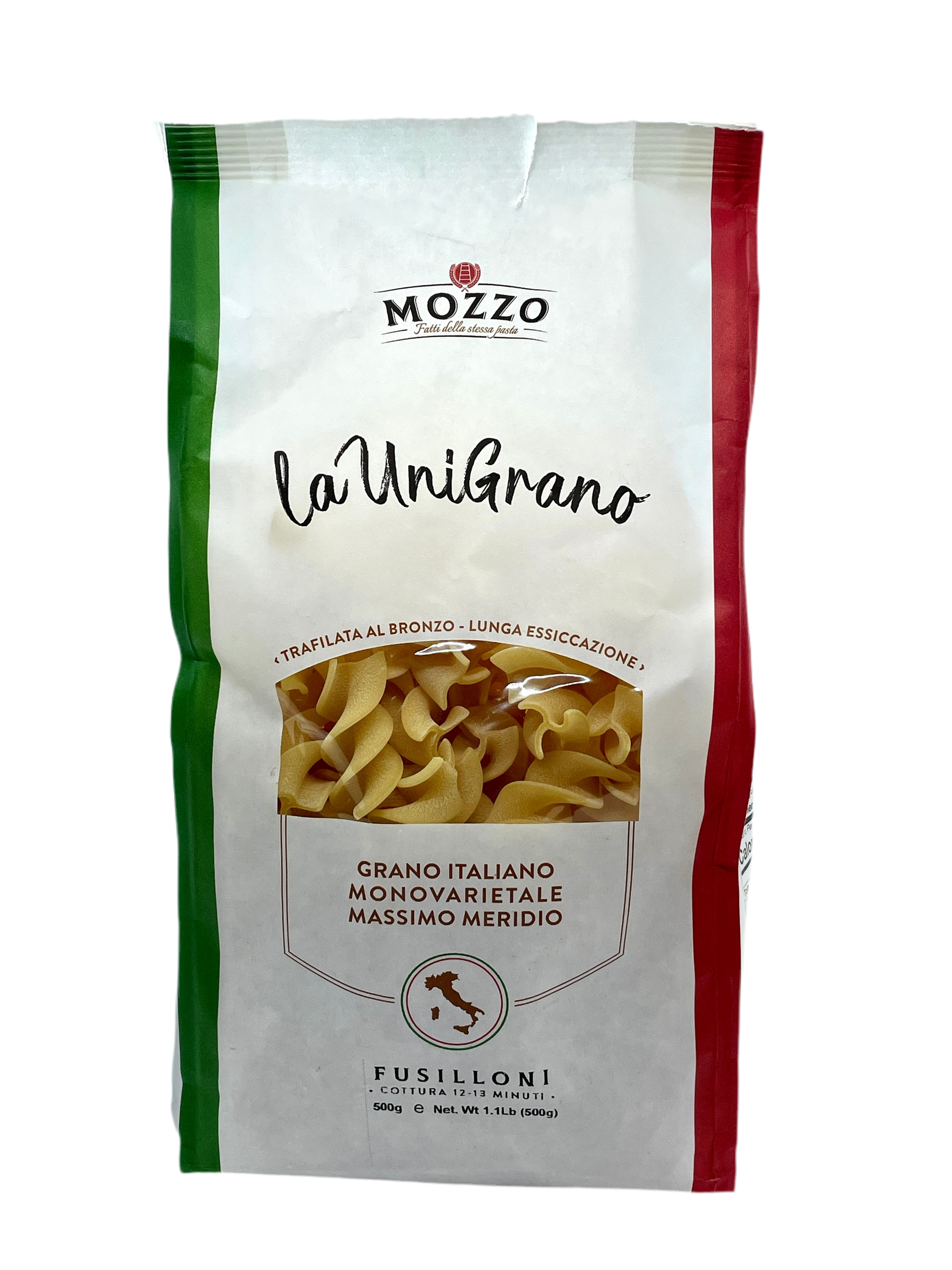 Fusilloni - Mozzo sind große, spiralförmige Nudeln mit einer markanten dicken Textur und einer gerillten Oberfläche, die ideal dafür sorgt, dass Saucen besonders gut haften. Diese spezielle Form eignet sich hervorragend für herzhafte Saucen, Pesto oder Gemüsegerichte, da die Spiralen viel Sauce in ihrem Inneren halten. Die Pasta wird in der Regel aus Hartweizengrieß hergestellt und behält beim Kochen ihre festere Struktur und al dente-Konsistenz. Die Mozzo-Variante weist häufig auf eine besonders hochwertige oder handwerklich produzierte Pasta hin, die für ihre lange Kochzeit und perfekte Textur bekannt ist.