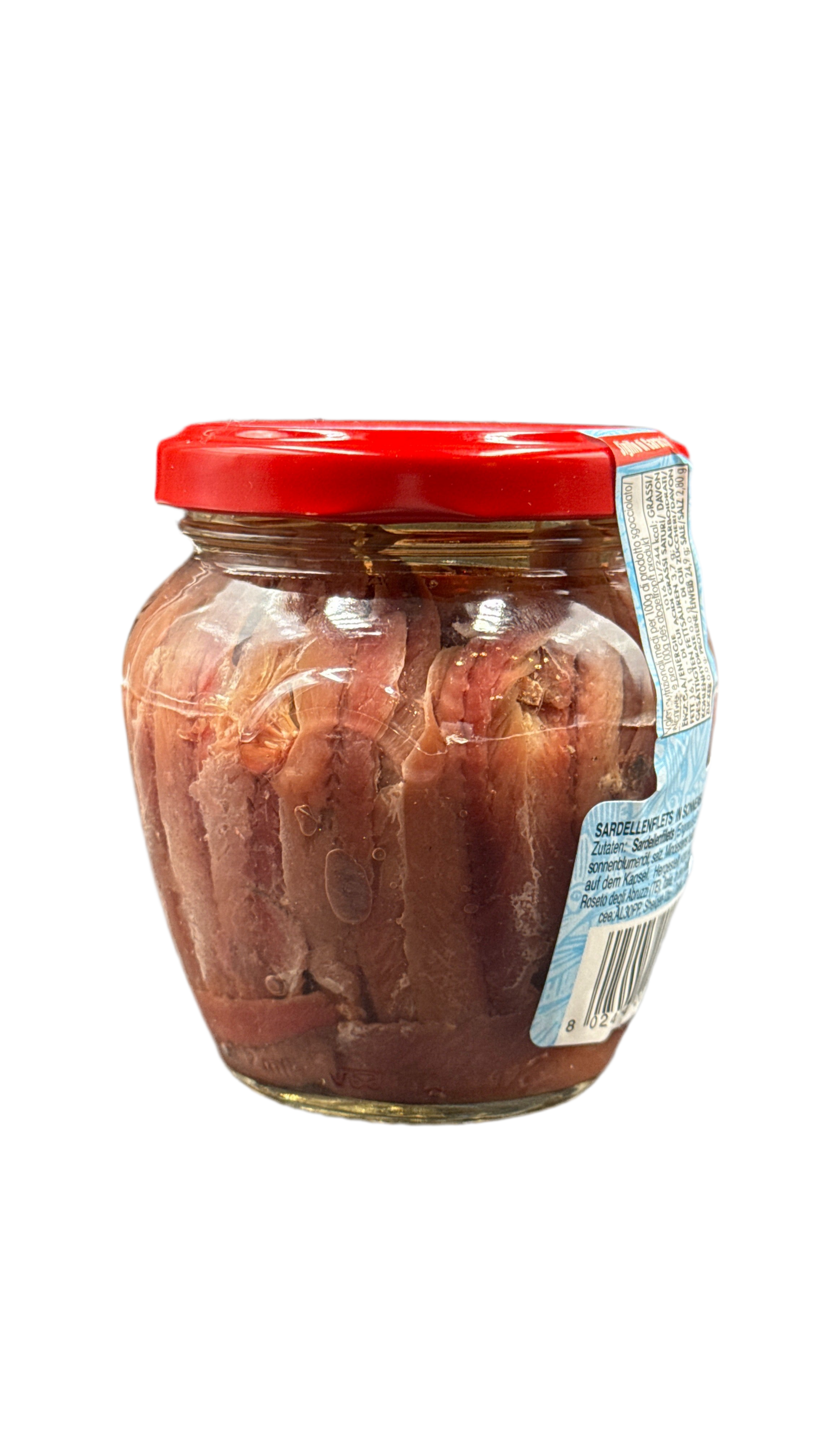 Unsere Mare Filetti di Acciughe präsentieren erlesene Sardellenfilets, sorgfältig in hochwertigem Sonnenblumenöl konserviert. Diese 200g-Packung bietet den authentischen Geschmack des Mittelmeers mit der perfekten Balance aus Salzigkeit und feinem Fischcharakter. Die handverlesenen Filets werden nach traditioneller italienischer Methode verarbeitet, was ihre zarte Textur und das intensive Aroma bewahrt. Ideal zur Verfeinerung mediterraner Gerichte, als Zutat für klassische Saucen oder als geschmackvoller Akzent auf Antipasti. Ein unverzichtbares Qualitätsprodukt für anspruchsvolle Hobbyköche und Feinschmecker, die Wert auf authentische italienische Küchentraditionen legen.
