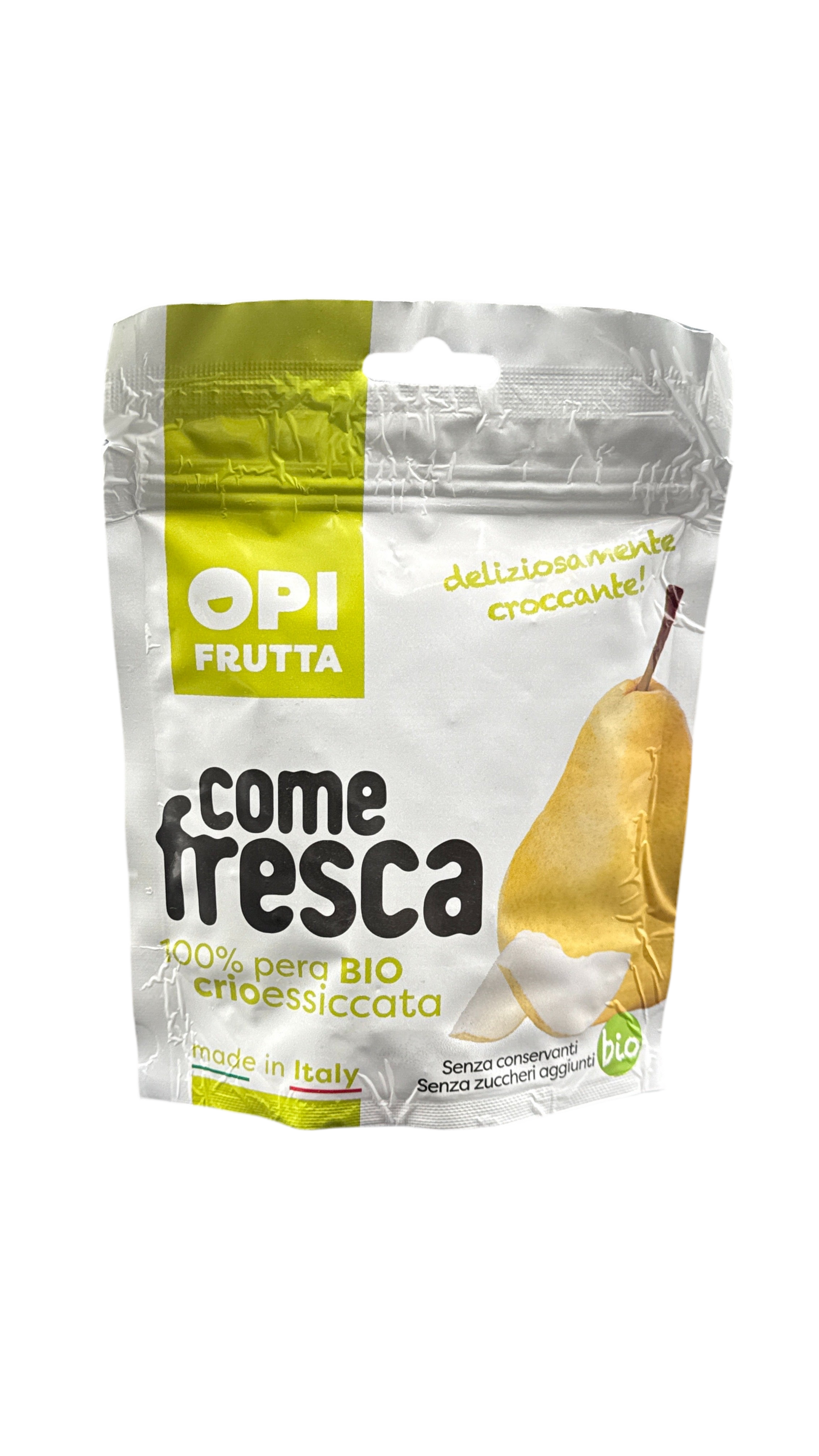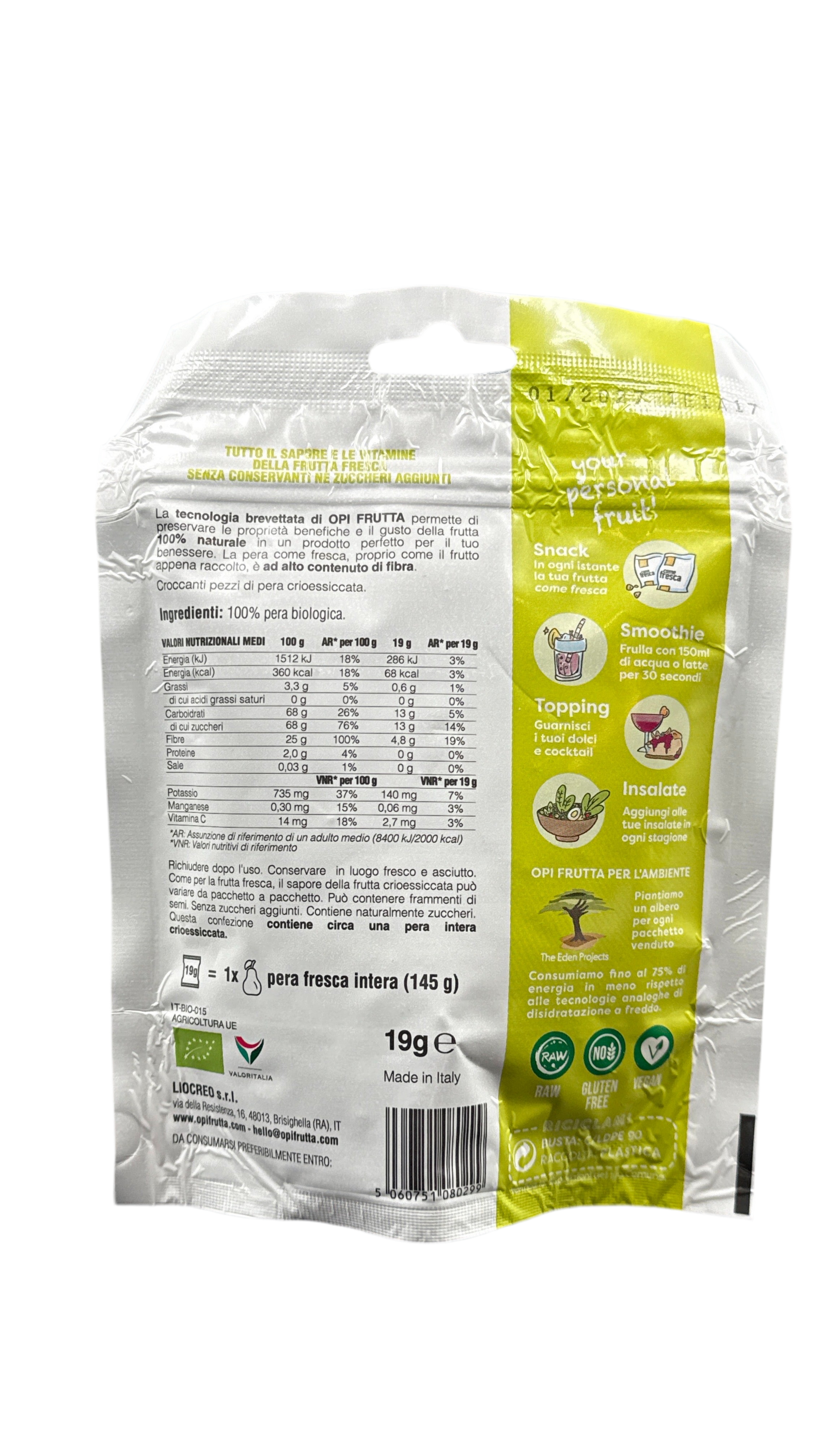 Unsere Opi Frutta gefriergetrocknete Birne präsentiert sich in ihrer reinsten Form - 100% biologische Birne, schonend gefriergetrocknet, um das volle Aromaspektrum und die wertvollen Nährstoffe zu bewahren. Dieses 19g-Päckchen bietet einen intensiven Geschmack ohne jegliche Zusatzstoffe. Die spezielle Gefriertrocknung erhält die natürliche Süße und die knackige Textur der Frucht, während alle Vitamine und Mineralstoffe erhalten bleiben. Ein idealer Begleiter für unterwegs, als Snack oder als raffinierte Zutat in Müslis und Desserts. Zertifiziert biologisch angebaut für höchste Qualität und Nachhaltigkeit.