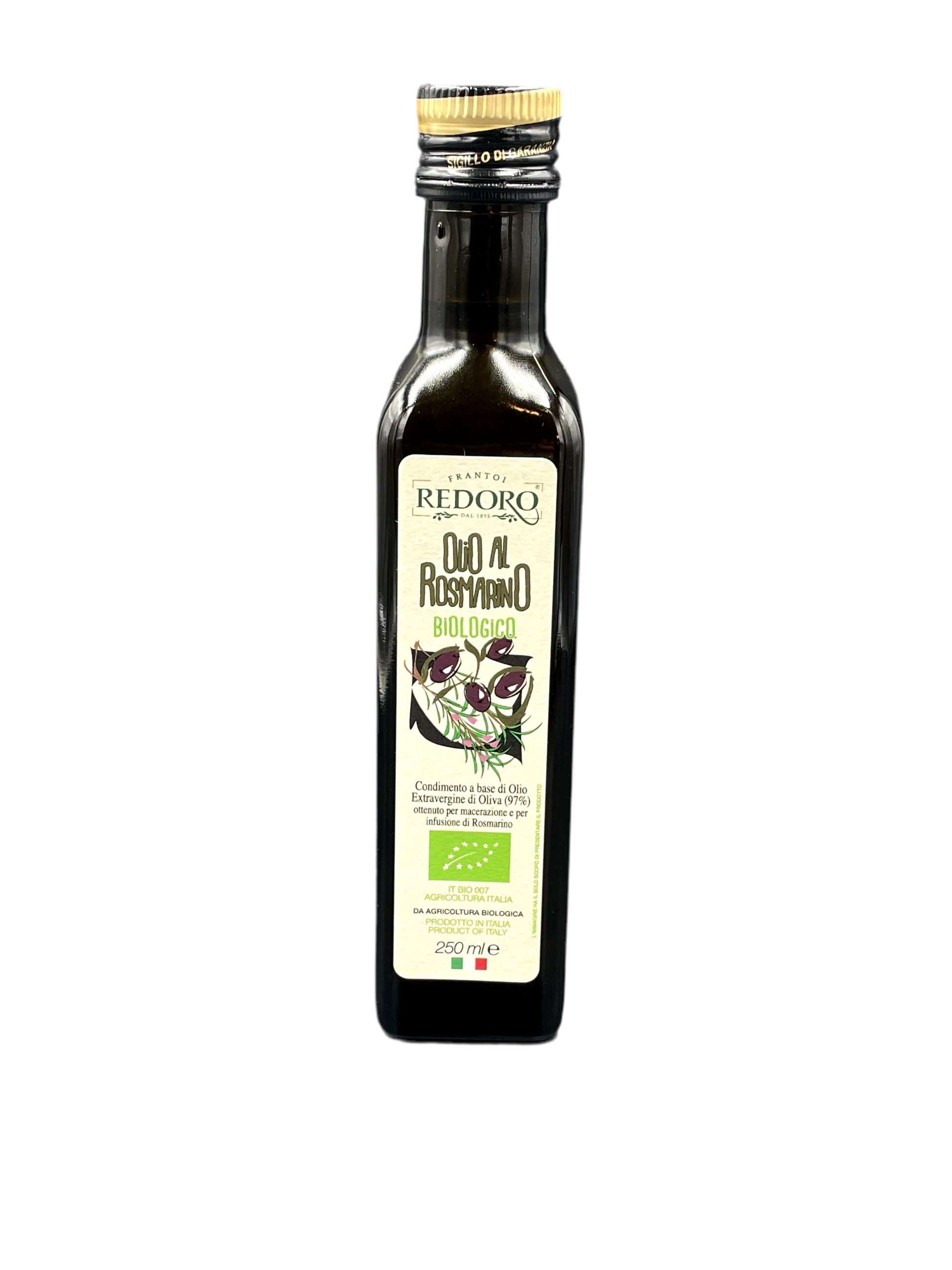 Ein Olivenöl, das mit Rosmarin aromatisiert und verfeinert wurde, um einen intensiven, mediterranen Geschmack zu erzielen. Das Öl wird aus Oliven aus biologischem Anbau in Italien hergestellt und mit frischen Rosmarinzweigen angereichert, die ihm eine angenehme Kräuternote und subtile Frische verleihen.